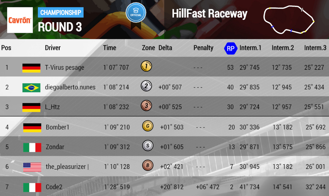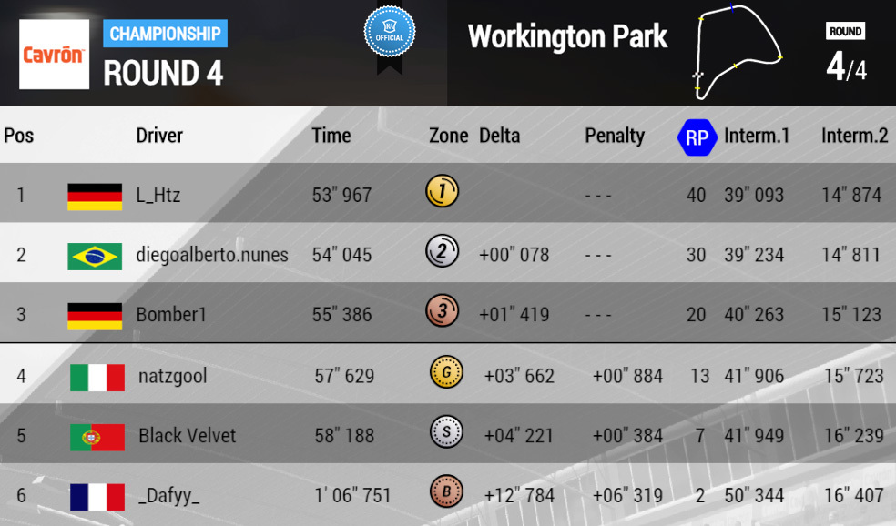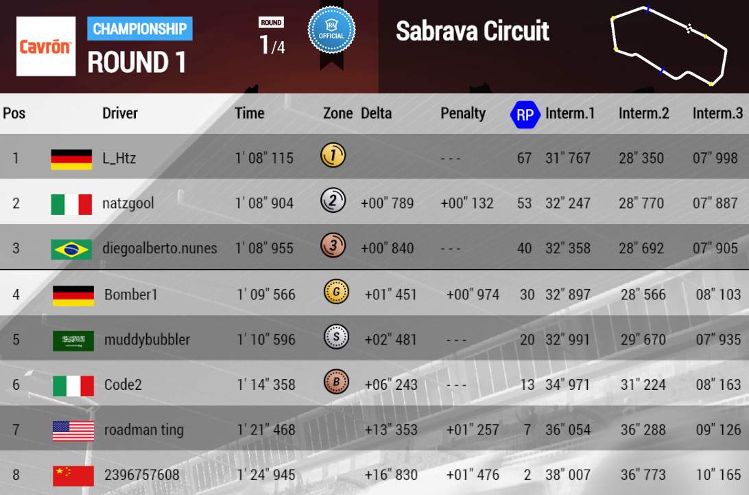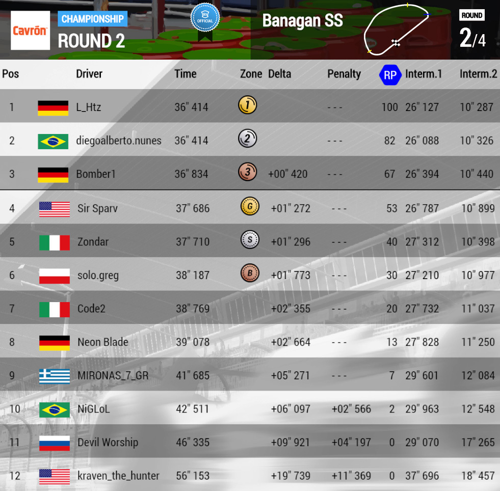 L_Htz(Hugyn) keeps the lead after the second round of the Cavrón Cup, followed by the Brazilian rookie diegoalberto, who won the Daah Prix, and Bomber1.