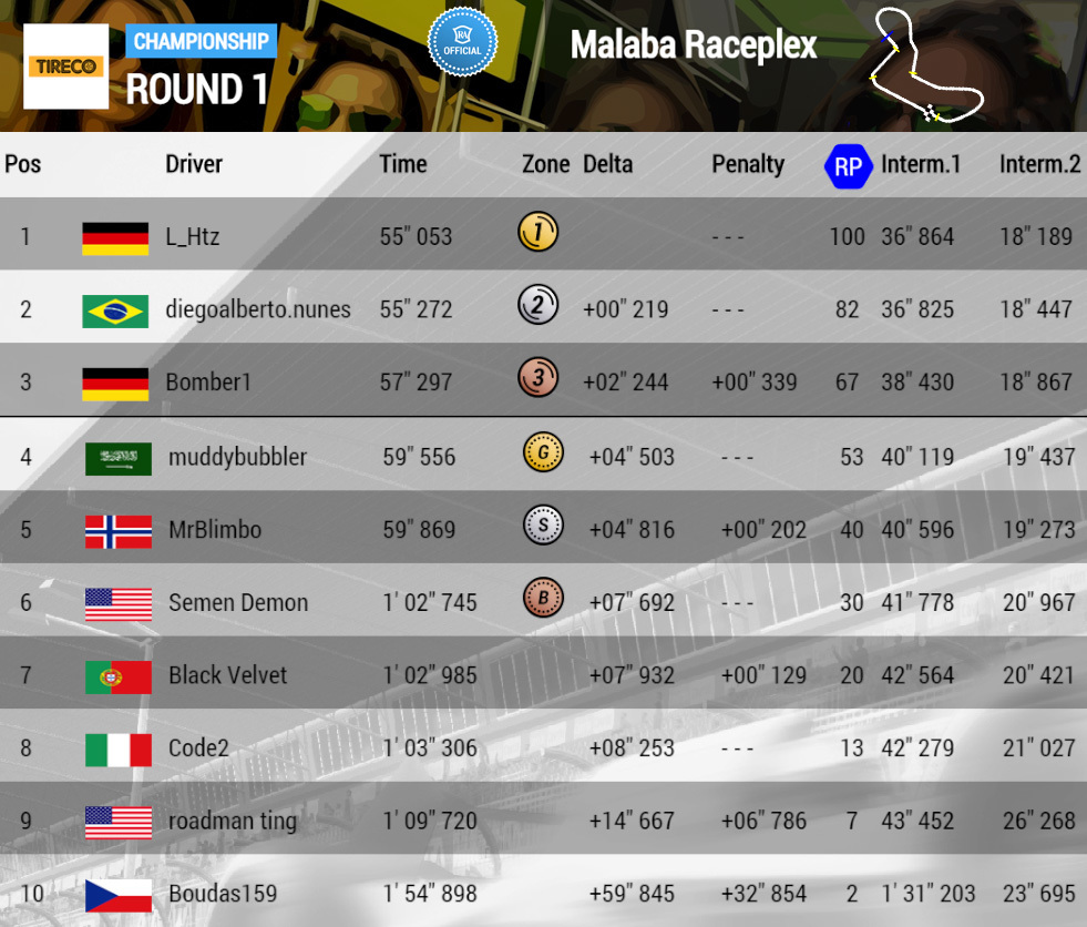 Congratulations to L_Htz and diegoalberto for reaching 1st and 2nd place in both the first and second rounds of the Tireco Cup!