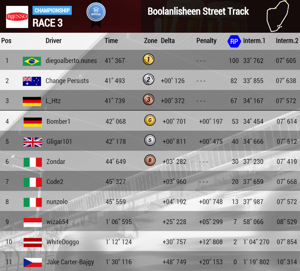 In 3rd place, not too far away from Change P., is Bomber1, a racer of great consistency evincible by the fact of always figuring among the top players.