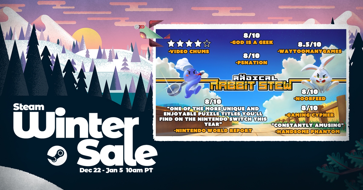 To celebrate the upcoming Winter Sale we have a stream with Pugstorm playing through Radical Rabbit Stew (as well as some extra behind the scenes additions). Watch with our community: new fans can grab the game for 75% off, and returning fans can experience insider conversations with the developers about what went into each level.