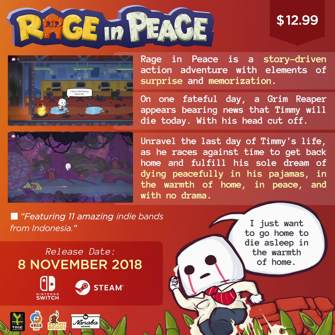 Thank you for your support! We won't be here without you all! We are so excited for the game to be released and bet you all are too! All we hope is that you will enjoy this game. Feel free to join the discussion at Toge Productions Discord server here. We'll be there to hear your feedback or even just for a random talk, as well as other Rage in Peace players from all around the globe.