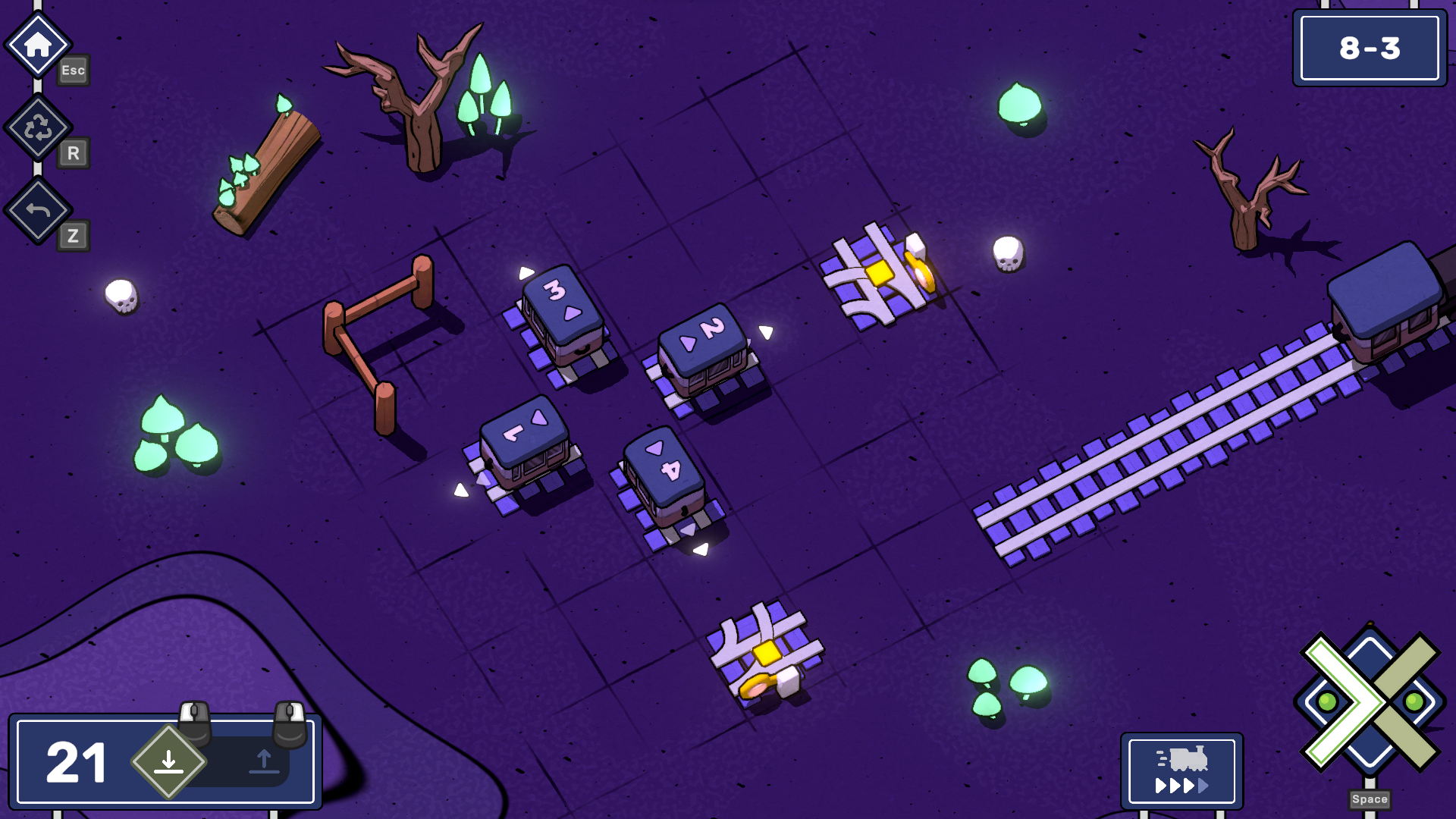 The Halloween spirit has taken over Railbound! As our adventurous dog duo chug along, they've stumbled upon some eerily festive decorations in World 8. Under the cloak of night, the world takes on a different hue, making each puzzle a bewitching challenge. The path is illuminated by the mesmerizing glow of mushrooms, and skulls scattered around watch silently as you pass.