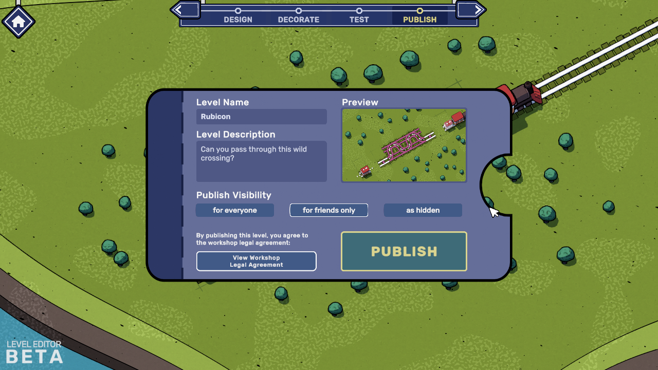 The last step is the Publish stage - name your level, give it a fun description, decide whether to share it with yourself, your friends or all Railbound players - and off you go!