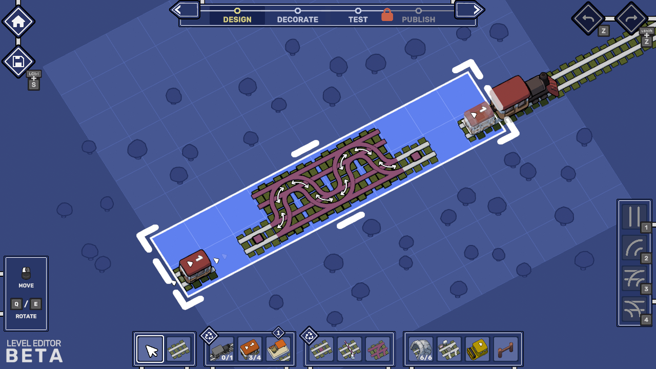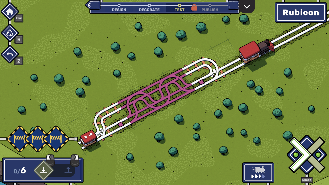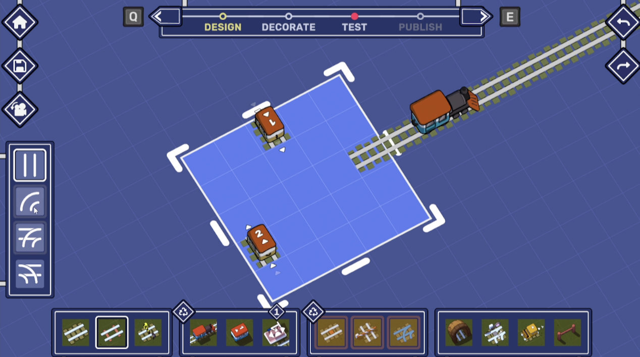 Once you're happy with your results it's time to Test your creation - in this mode you need to show that your puzzle can actually be solved before being able to share it with the world. You'll have unlimited rails at your disposal, but when sharing the puzzle with everyone else we're using your result (the amount of tiles you laid) to limit the available rail count for players.
