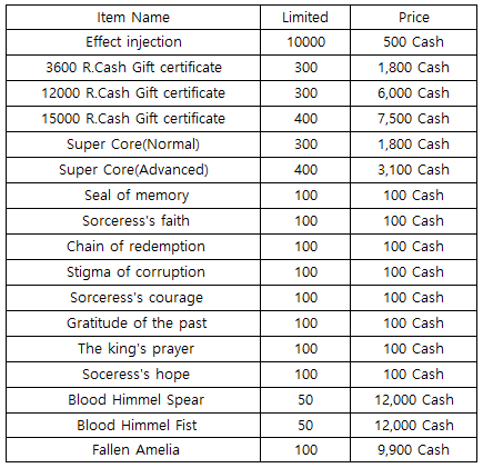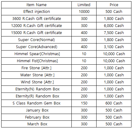 3) Happy Hour event(When you stay at the server at this time, you will get rewards) - 18:30 : Blood Himmel Random Box - 19:30 : 1000 R.Cash Gift certificate - 20:30 : Stage unlimits(1h)