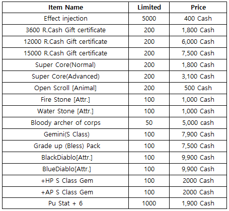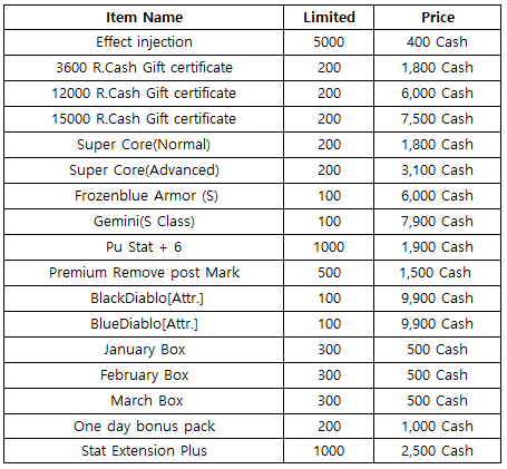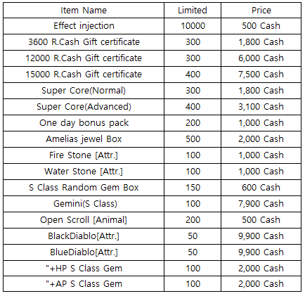 3) Happy Hour event(When you stay at the server at this time, you will get rewards) - 18:30 : Stage unlimits(1h) - 19:30 : Super Core(Advanced) - 20:30 : 1000 R.Cash Gift certificate
