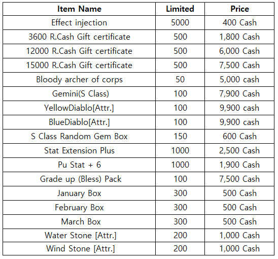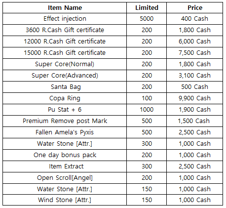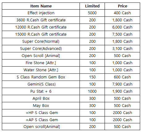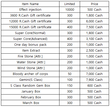 3) Happy Hour event(When you stay at the server at this time, you will get rewards) - 18:30 : Super Core(Advanced) - 19:30 : 1000 R.Cash Gift certificate - 20:30 : Stage unlimits(1h)
