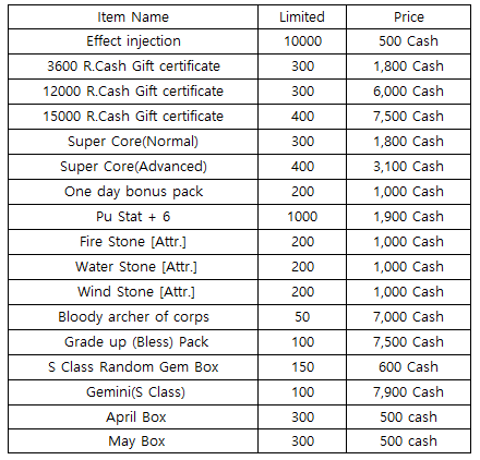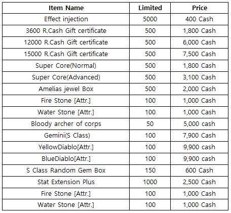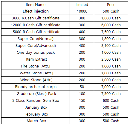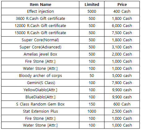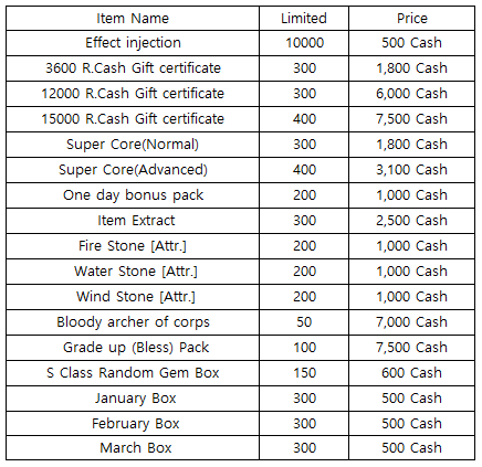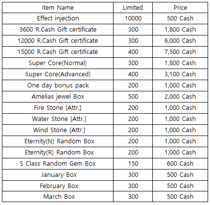 3) Happy Hour event(When you stay at the server at this time, you will get rewards) - 18:30 : 1000 R.Cash Gift certificate - 19:30 : One day Bonus Pack - 20:30 : Super Core(Normal)