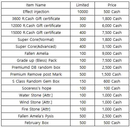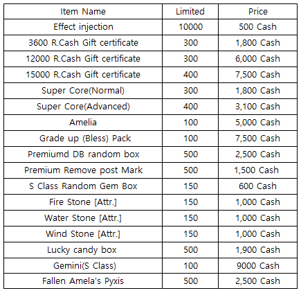 3) Happy Hour event(When you stay at the server at this time, you will get rewards) - 18:30 : 500 R.Cash Gift certific - 19:30 : Random point bag (S) - 20:30 : Super Core(Normal)