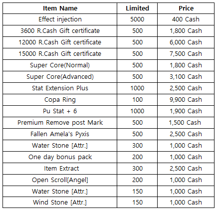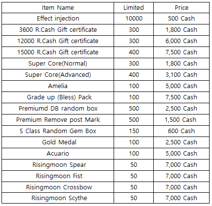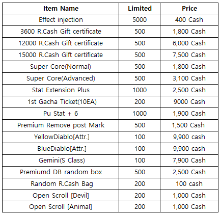 3) Happy Hour event(When you stay at the server at this time, you will get rewards) - 18:30 : 1000 R.Cash Gift certifiate - 19:30 : Super Core(Advanced) - 20:30 : Fee pass (1 hour)