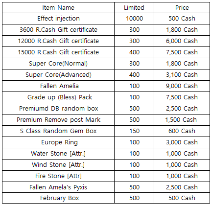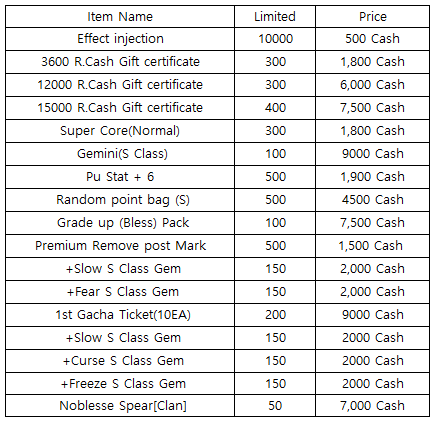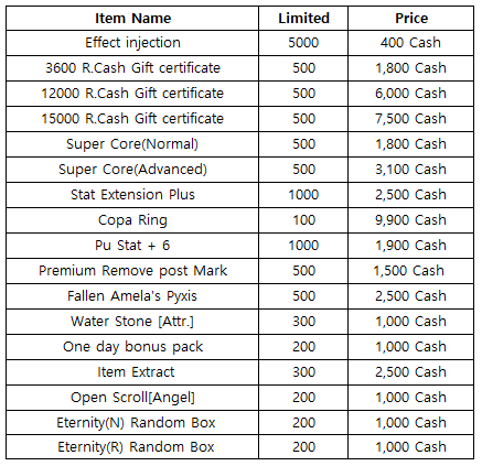 3) Happy Hour event(When you stay at the server at this time, you will get rewards) - 18:30 : 1000 R.Cash Gift certificate - 19:30 : Stage unlimits(1h) - 20:30 : Glory Gold Box