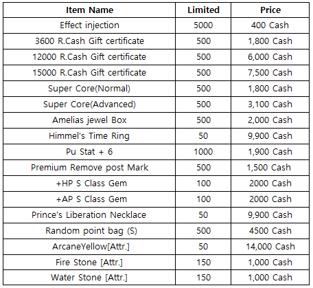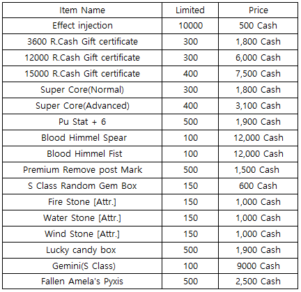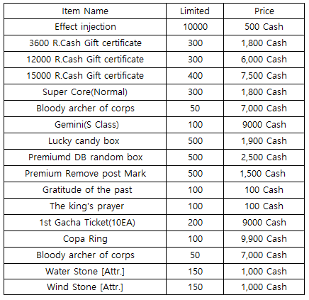 3) Happy Hour event(When you stay at the server at this time, you will get rewards) - 18:30 : 3rd Gacha Ticket(1EA) - 19:30 : Random R.Cash Bag - 20:30 : Random Cube