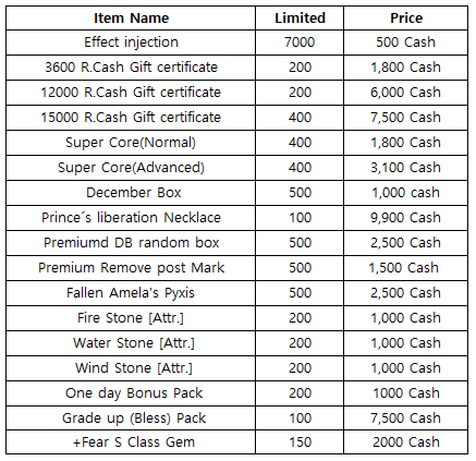 3) Happy Hour event(When you stay at the server at this time, you will get rewards) - 18:30 : 1000 R.Cash Gift certificate - 19:30 : December Box - 20:30 : Super Core(Normal)