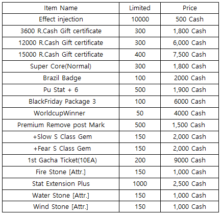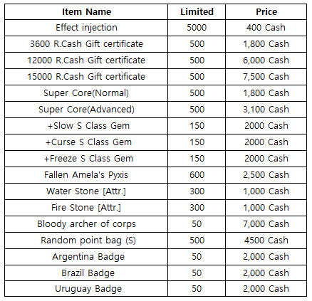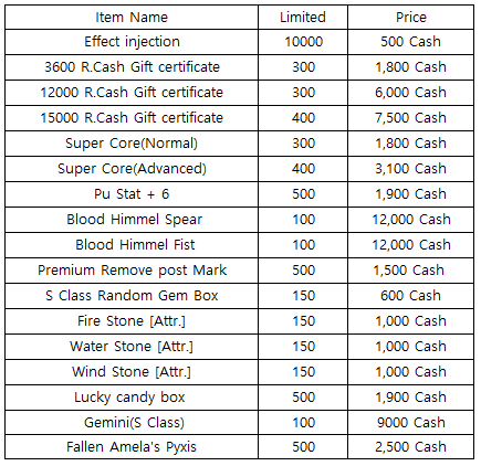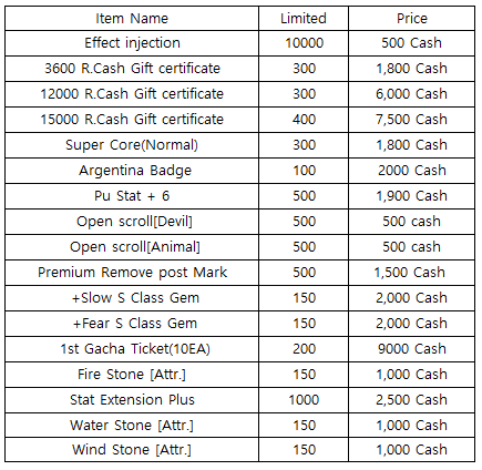 3) Happy Hour event(When you stay at the server at this time, you will get rewards) - 18:30 : 500 R.Cash Gift certific - 19:30 : Super Core(Advanced) - 20:30 : 2nd Gacha Ticket(1EA)