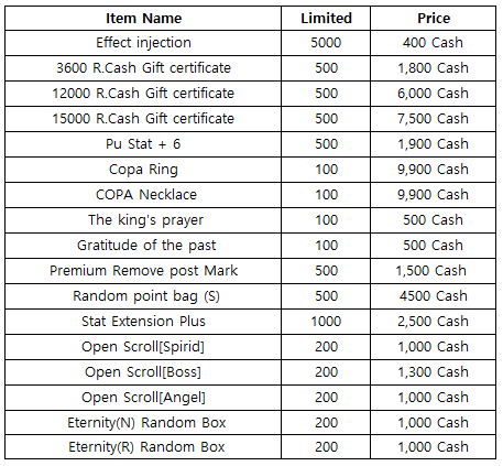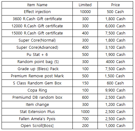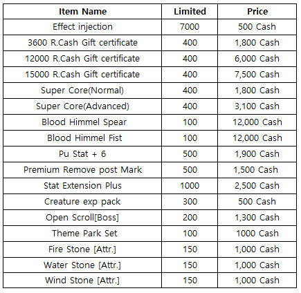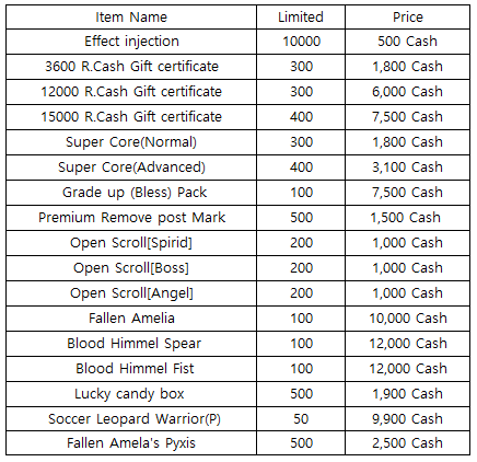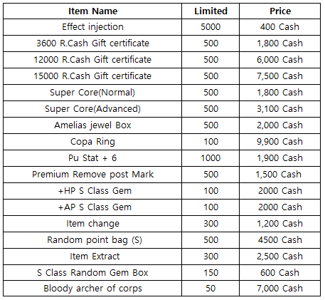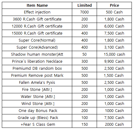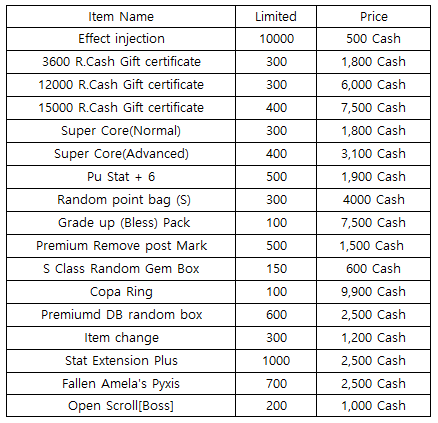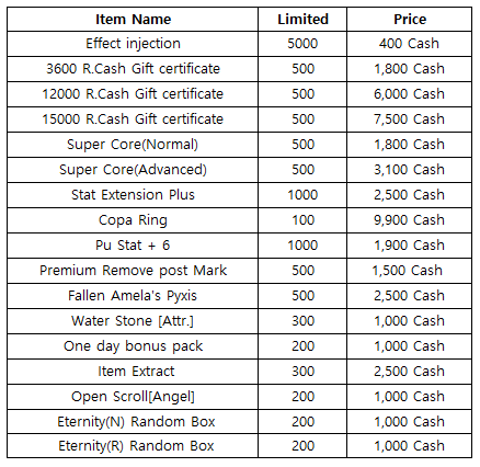 3) Happy Hour event(When you stay at the server at this time, you will get rewards) - 18:30 : 1000 R.Cash Gift certificate - 19:30 : Super Core(Advanced) - 20:30 : Chaos Max(30EA)