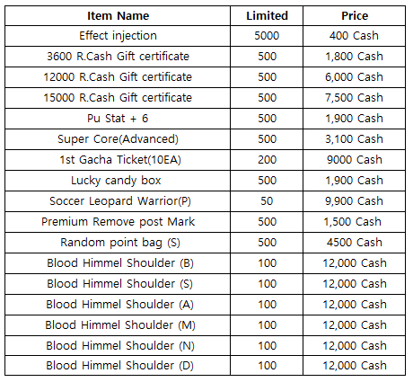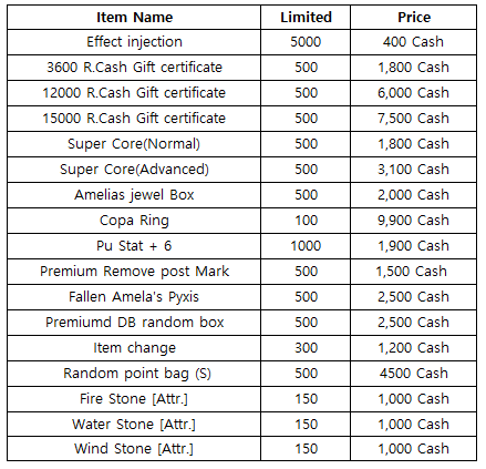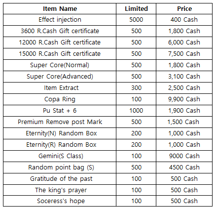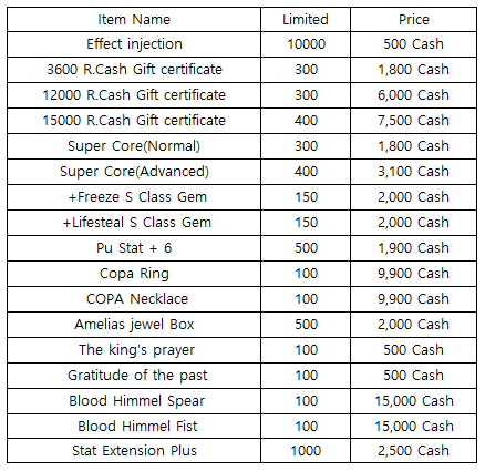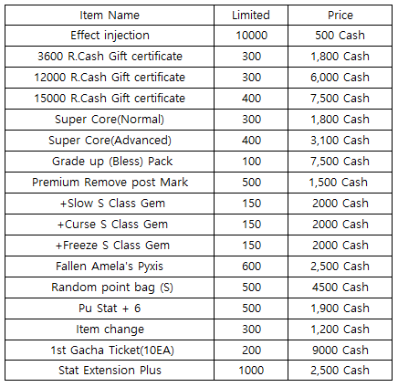 3) Happy Hour event(When you stay at the server at this time, you will get rewards) - 18:30 : Super Core(Normal) - 19:30 : 500 R.Cash Gift certific - 20:30 : Free pass (1 hour)