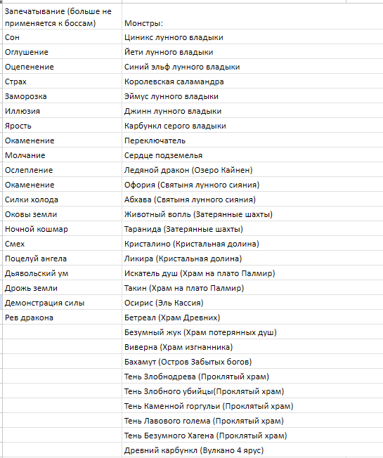▪ Fixed display of characteristics in the window of a character with an equipped medal. ▪ The "Slip" skill works on monsters. ▪Corrected the lack of creature Mana increase that [Boss Card] Phoenix of Chaos: Summoner gives. ▪Divine Cross and Divine Spear skill debuffs now work on bosses. ▪Bosses on the Island of Forgotten Gods now drop weapons in boxes. ▪The following effects no longer work on the monsters listed below (see screenshot) ▪ Fixed an issue with the auction search when the "View available equipment" checkbox is checked. ▪Added the ability to exchange several items at once at Intendant Lusiad, instead of 1 for 1. ▪ Increased the drop rate in Twilight Dungeon and Cursed Temple. ▪ The Philosopher's Scroll can now be obtained from the Cursed Temple, Celestial Fortress, Labyrinth of Light and Twilight Dungeon. ▪Added a visual effect for the [Boss Card] Phoenix of Chaos: Summoner card. ▪ Removed the weapon limitation for the skills Sacrifice of Sura (random skill) and Notch of Darkness (random skill). ▪ Increased damage from magical skills to the Last Devastating Attack skill (random skill): 10 + (Skill Level *5)%