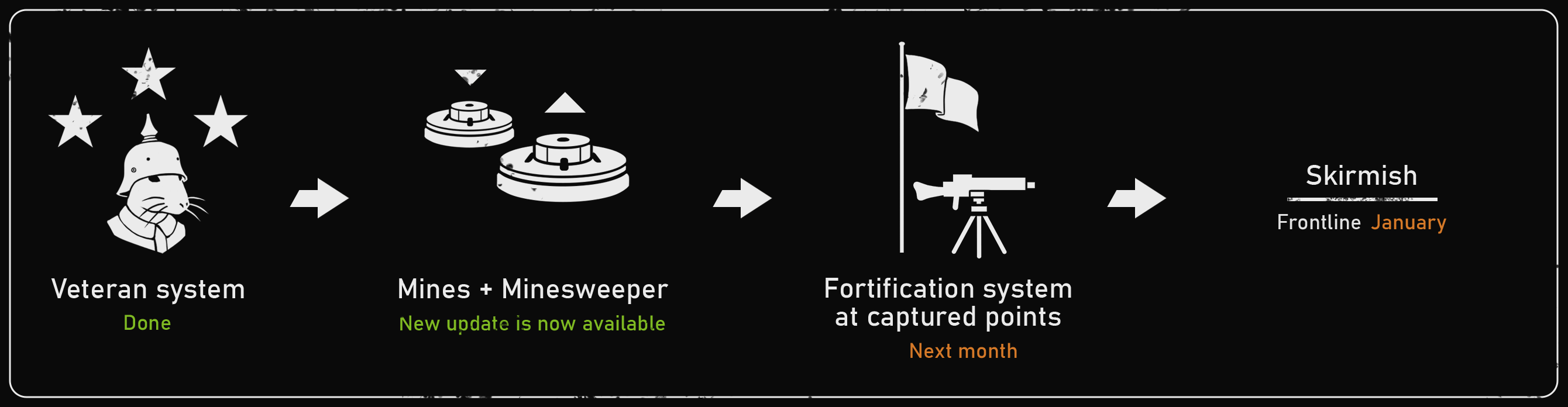 It consists of 4 points: 1) The veterancy system, we have already implemented it and built it into the game last month. It will allow your units to become stronger in battle, which will help you in the Skirmish mode. 2) Today, we added Sappers and the ability to mine and defuse mines in the game. Now it is not very useful, however, in the defense mode and in future missions - it will be an important strategic tool. 3) Next month, we plan to give you the ability to fortify captured points, place guns and small fortifications on them, so that you can defend your game points. 4) In January, we plan to introduce Skirmish – Frontline mode. This is a mode in which you will be able to fight waves of enemies, using all the necessary mechanics that we are implementing.