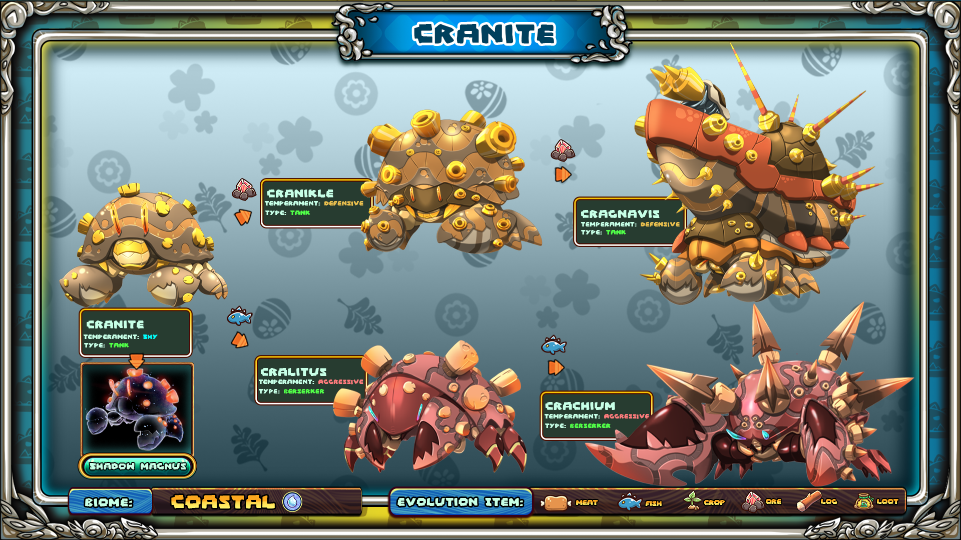 The Cranite has a chance to go through two distinct lines of evolution, the Cragnavis or Crachium line. Both seem to have an impressive ability to burrow into the ground, this allows them to blend into their surroundings and capture prey without detection. The Cragnavis line are generally less aggressive but they travel in what almost seems like a herd, if one of them is attacked then others in the vicinity will rush to fend off the attacker together. The Crachium on the other hand are more solitary creature, prefering to comb the beaches and spear unsuspecting fish from the shallow waters.