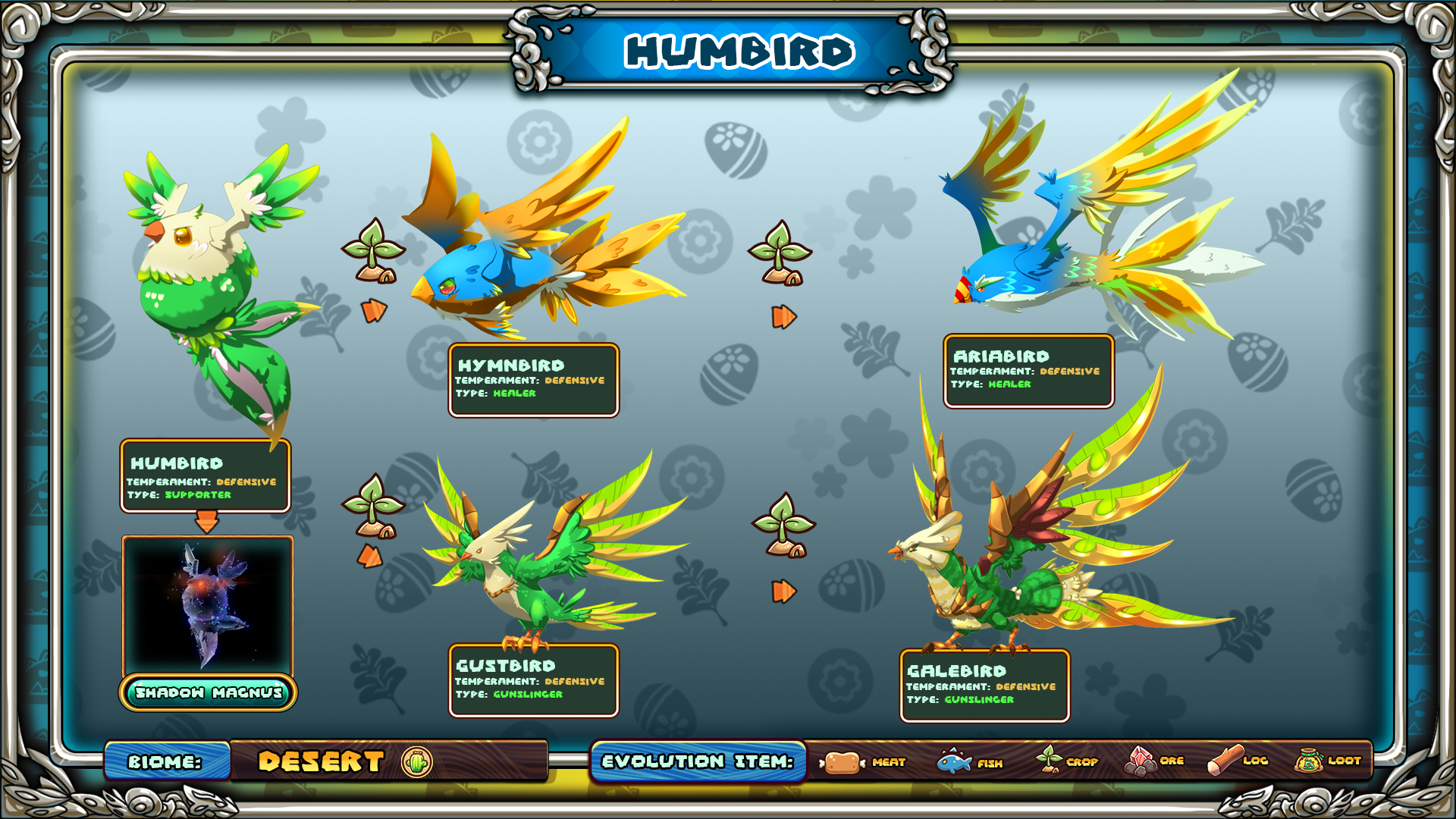 The Humbird has two forms that it can mature into, those being the Hymnbird and the Gustbird. The Hymnbird is a master at controlling the healing winds, being able to close even the deepest cuts and mend bones by simply using wind magic. The Gustbird on the other hand uses wind magic for a much more destructive purpose. Unlike the soft feathers on the Hymnbird, the Gustbird has razor sharp feathers that can slice with terrifying effectiveness. They both make wonderful companions, but stay away from the sharp bits.