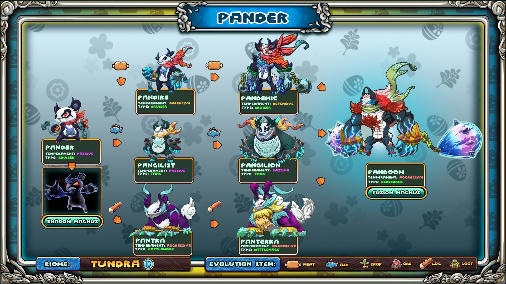 Panders live in the mountains of the Frigid Tundra, relatively isolated and protected from most of the cold. The Panders have built a society around the prophecy of the coming doom, readying themselves for the End that is to Come. A Pander’s life is filled with training and growth, each Pander will be allowed to choose which path it wishes to take and it eventually leads to different evolutions when the time comes. The three distinct paths of the Pander ultimately teaches the same principles, strength and discipline will allow the Pander race to escape from Doom.