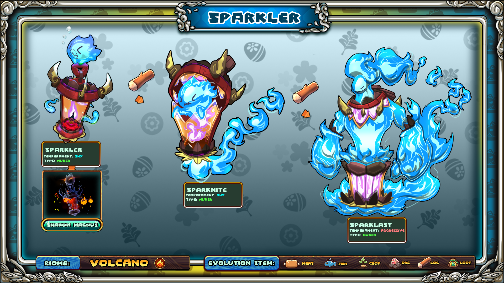 Many travellers and adventurers to the Fallen Kingdom would recount the Sparkler as a common sight to behold while traversing through the ruins. The image of a lantern bearing fiery wisp often comes up for many of the modern illustrations of the now volcanic wasteland. According to Library records however, this wasn’t always the case, Sparklers used to be a much rarer occurrence before the Corruption.