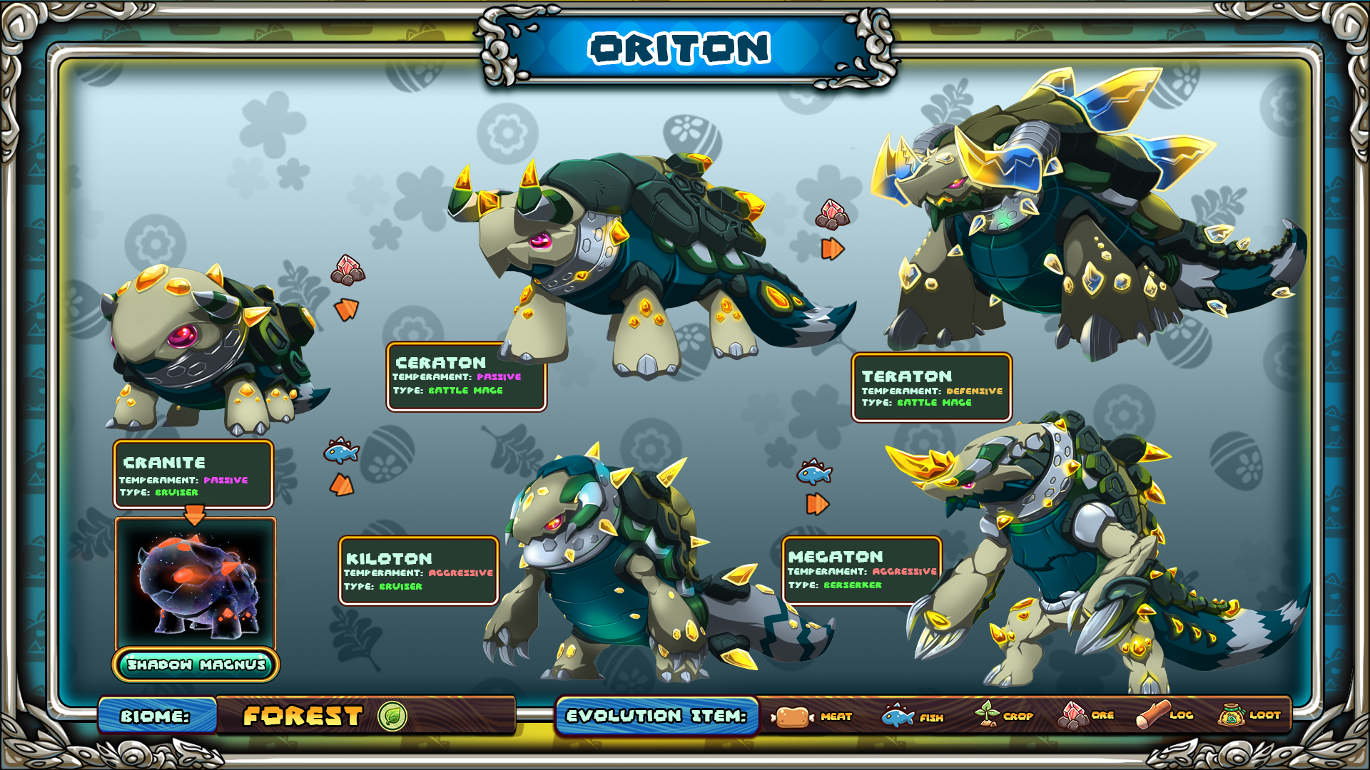 Observation of the Oriton shows two distinct branches of physical maturity, one being the quadrupedal Ceraton and the bipedal Kiloton. Notable difference in the Oriton’s diet can be observed between the two, the ones that eventually become Ceratons can be seen munching on Silver ore while the other can be observed in shallow waters catching fish to eat. If the Old stories are anything to go by, it is best if one does not approach these ancient beast lest one wishes to incur their wrath.
