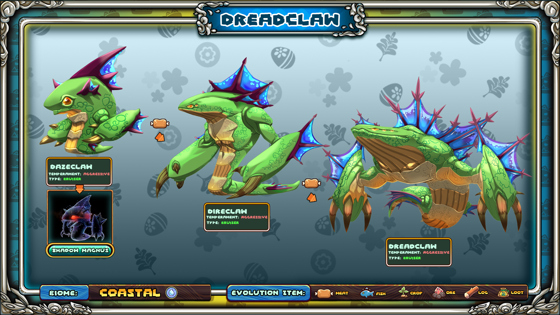 It is known that the Dreadclaw was once worshiped by the denizens of Ethia, its stone temple still stands hidden within Vokka Island. According to Library records, it was once the patron god of fishing, hunting and feasts, however all worship for the Dreadclaw came to an abrupt end. The scholarly community has debated and deliberated the cause of this occurrence, but it still remains a mystery to us all.