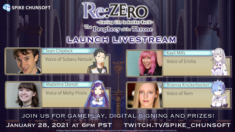 We are having a livestream with the amazing English voice cast of Re:ZERO -Starting Life in Another World- The Prophecy of the Throne on 1/28 at 6pm pst! Join us for gameplay, digital signing, and a giveaway!