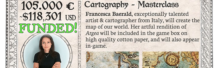As you may remember, a map painted by the talented Francesca Baerald was our first stretch goal. Today, we can proudly present the magnificent outcome. Francesca delivered a masterpiece of a map with a huge number of details and a high density of information for the player. Cities, villages, dungeons, rivers, roads… all the major landmarks you will encounter on your journey through Argea are part of this highly detailed hand-painted map.
