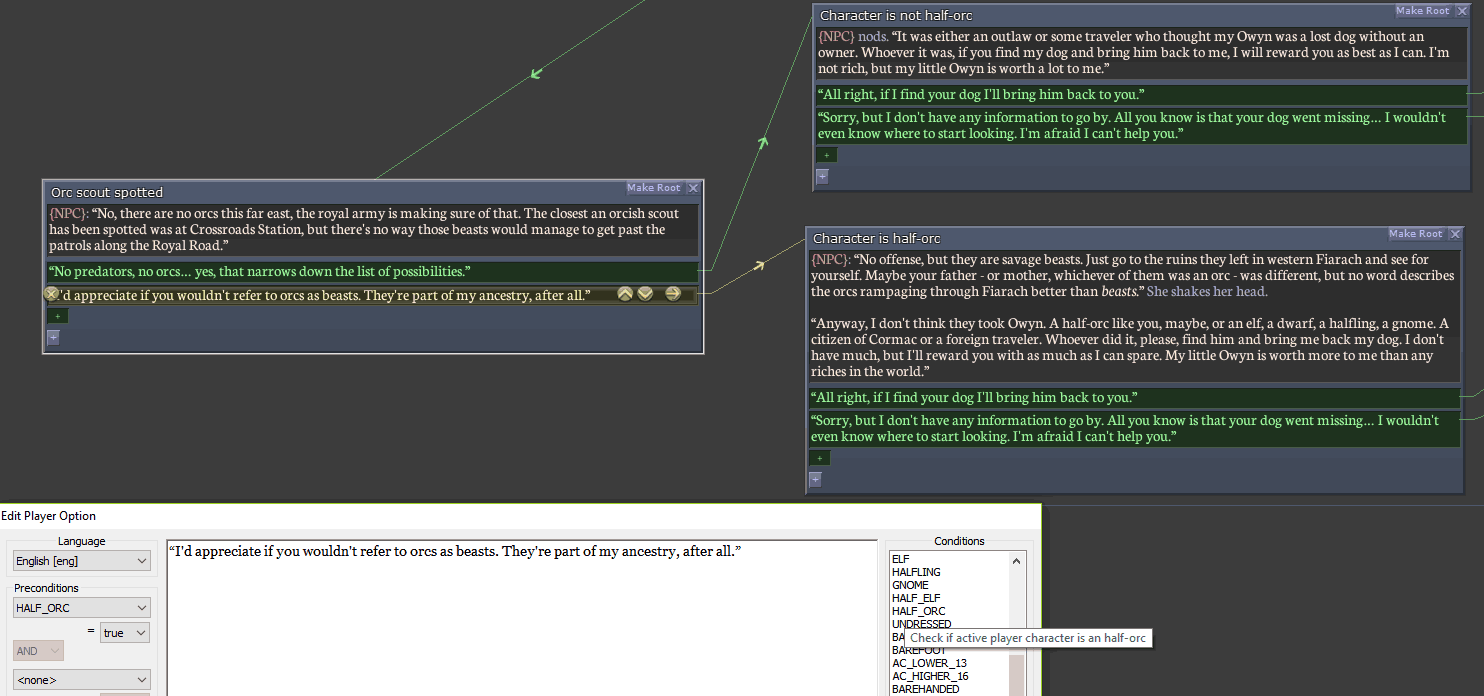 You may also notice that some of the dialogue options, and the dialogue spoken by the NPCs, contain some conditions in themselves. Things like the player’s gender, race and class will be referenced by NPCs when appropriate, and rather than writing the entire sentence anew, the scripting capabilities of Realms Beyond allow us to just set a condition around certain words of the sentence.
