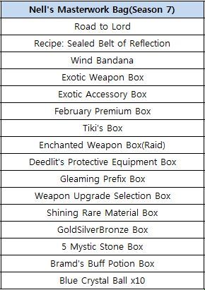 You can trade the items listed below with Nell’s Masterwork Seal from Nell’s Secret Shop.