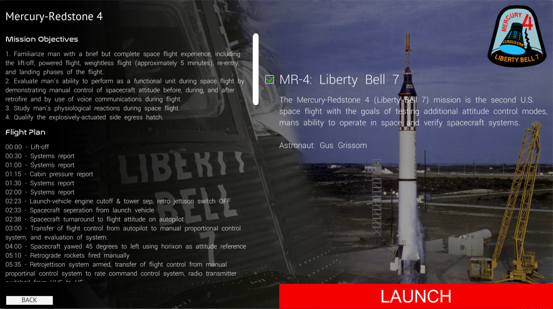 New mission: Mercury-Redstone 3 The Mercury-Redstone 3 was the first U.S. manned mission, where Alan Shepard became the first American in space. In this mission you will get to experience the flight with realistic voice comms and procedures. The mission will take you through this historical mission where you have to keep up with the busy schedule of these short sub-orbital missions.