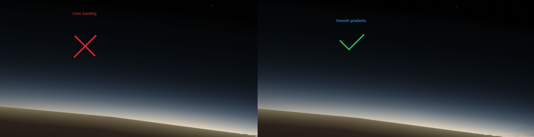 Orbit atmosphere rendering, color banding, and clouds I have spent a lot of time writing shaders in this update. A shader is basically a small program that runs on the GPU, instructing it how to process vertices and pixels for example. This update improves the rendering logic and shaders used to draw the atmosphere in space, and somewhat more realistically renders density.