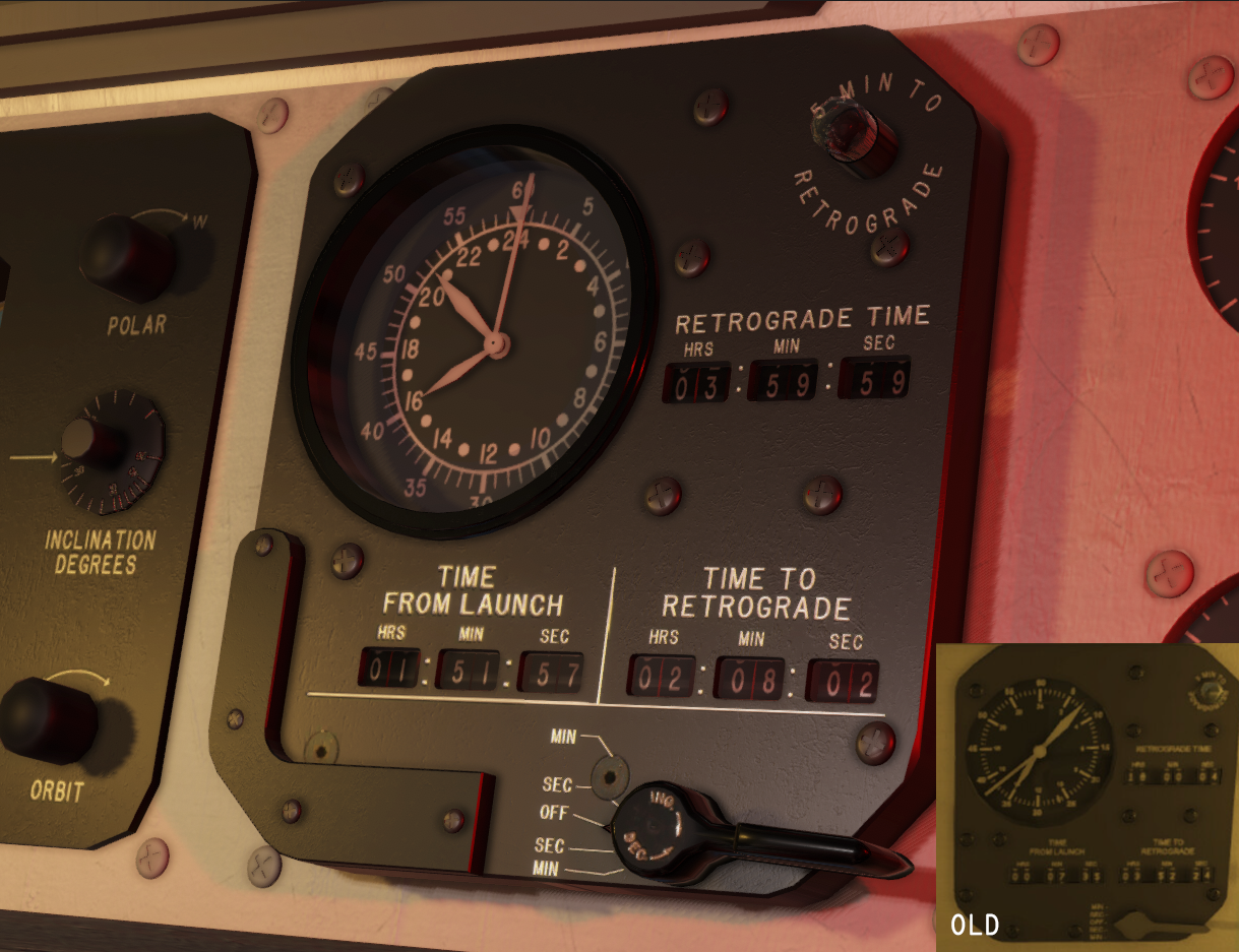 Project Mercury Cockpit Update: Satellite Clock The main tool for setting and adjusting the retrograde time, checking the current time and mission elapsed time is the Satellite clock located on the center panel. I have re-modelled the entire clock and its components, and corrected logical issues behind it. The retrograde timestamp is now in MET/GET, and should render the set retrograde time correctly. The selector below it can be used to increase or decrease the time. The clock graphics, marks and time handles has been re-implemented for a more realistic and accurate clock. You can use this to time activities and retro burns.