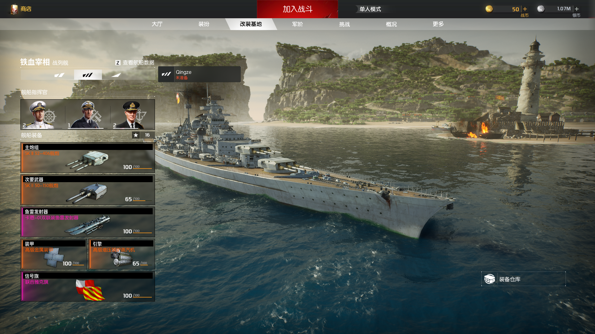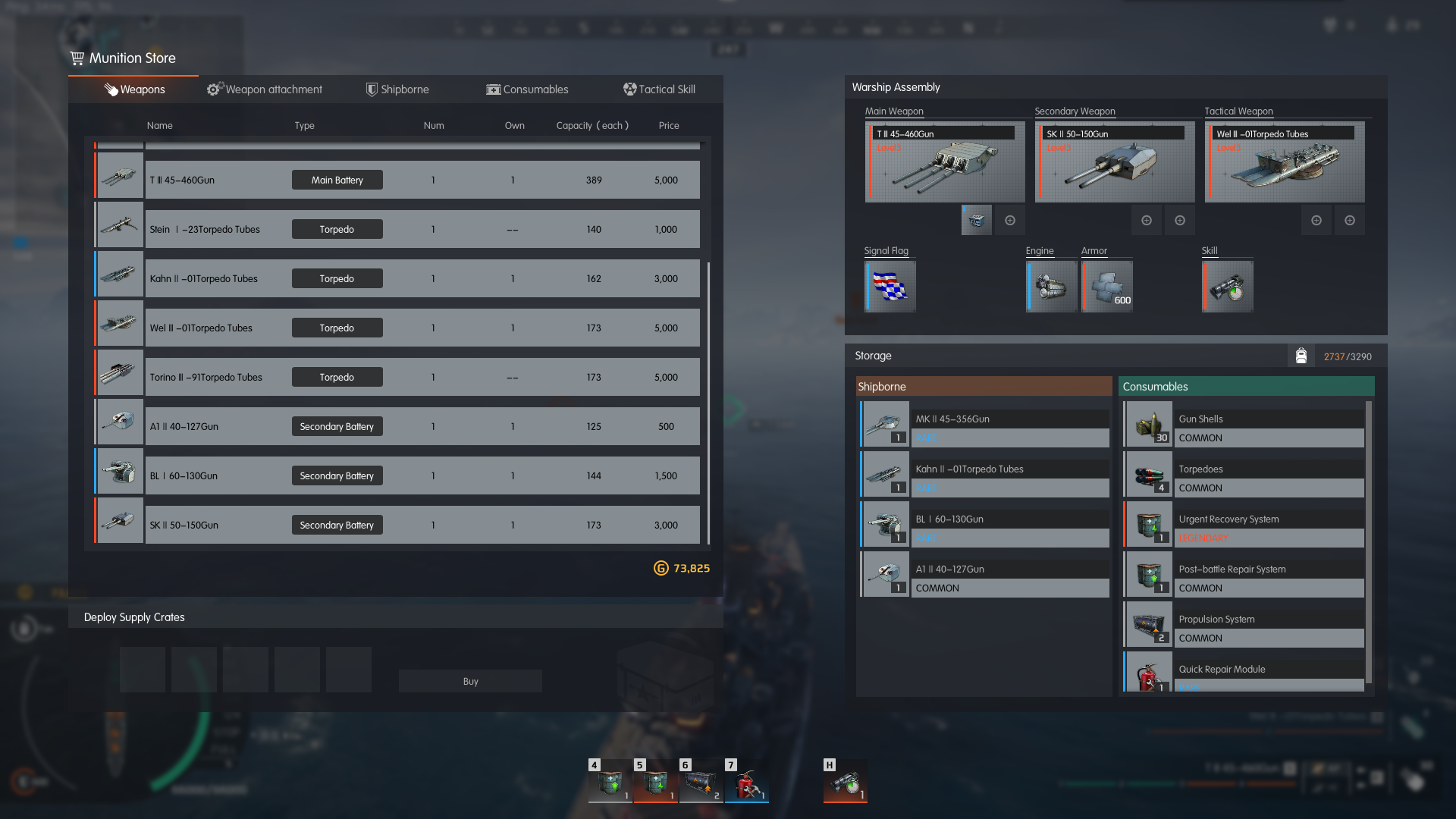 Warship Equipment System: Players may spend silver on equipment at the Store and take it to battles. In addition, equipment can no longer be redeemed by munitions in-battle. Instead, you can acquire it by salvaging, collecting supply crates, and sinking enemy ships. At the end of a battle, based on your performance, you may choose to take out the equipment.