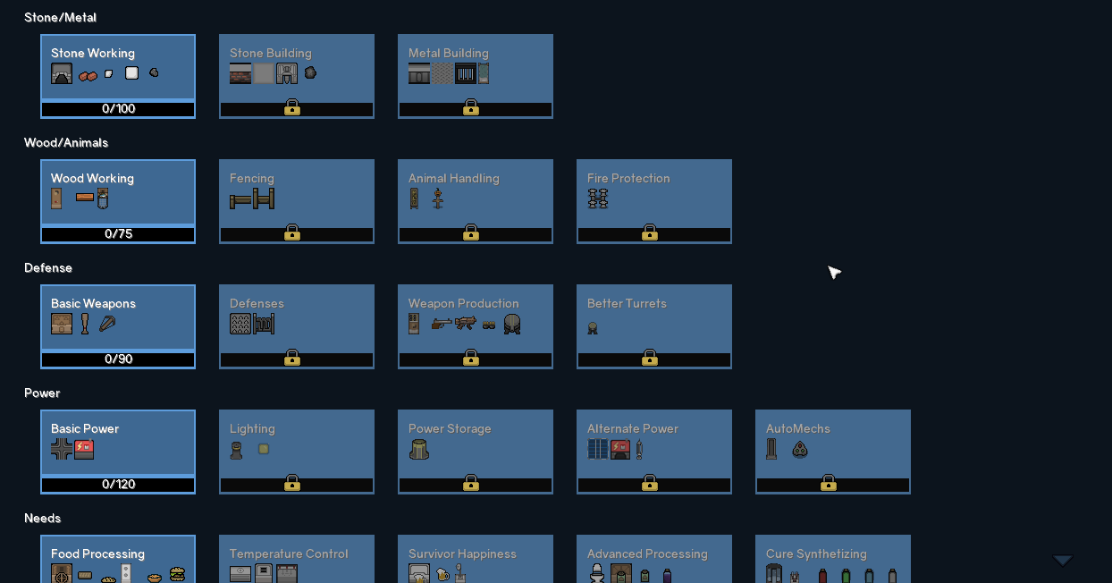 We have changed the science menu to make the early game less brutal. We moved defenses down into their own section and added crossbows. That means if you want you can research Basic Weapons right when the game starts and have a ranged weapon and melee weapon with your first research. As well we have added a Bear Hood that offers some protection and warmth without needing any research!