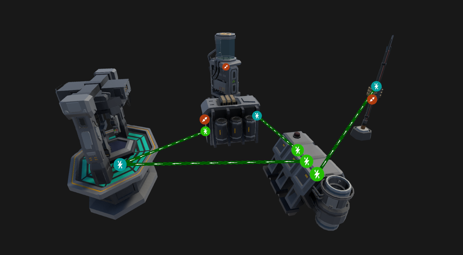 An early prototype of the new power system, each object will now have a marked Input and Output port for power.