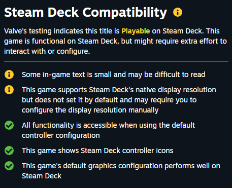 We're finally Steam Deck Playable! đđ While we're not fully verified yet, we are one step closer to that goal. To get the verified status, we still need to work on increasing font sizes in several parts of the UI and make the deck's native resolution the default one.