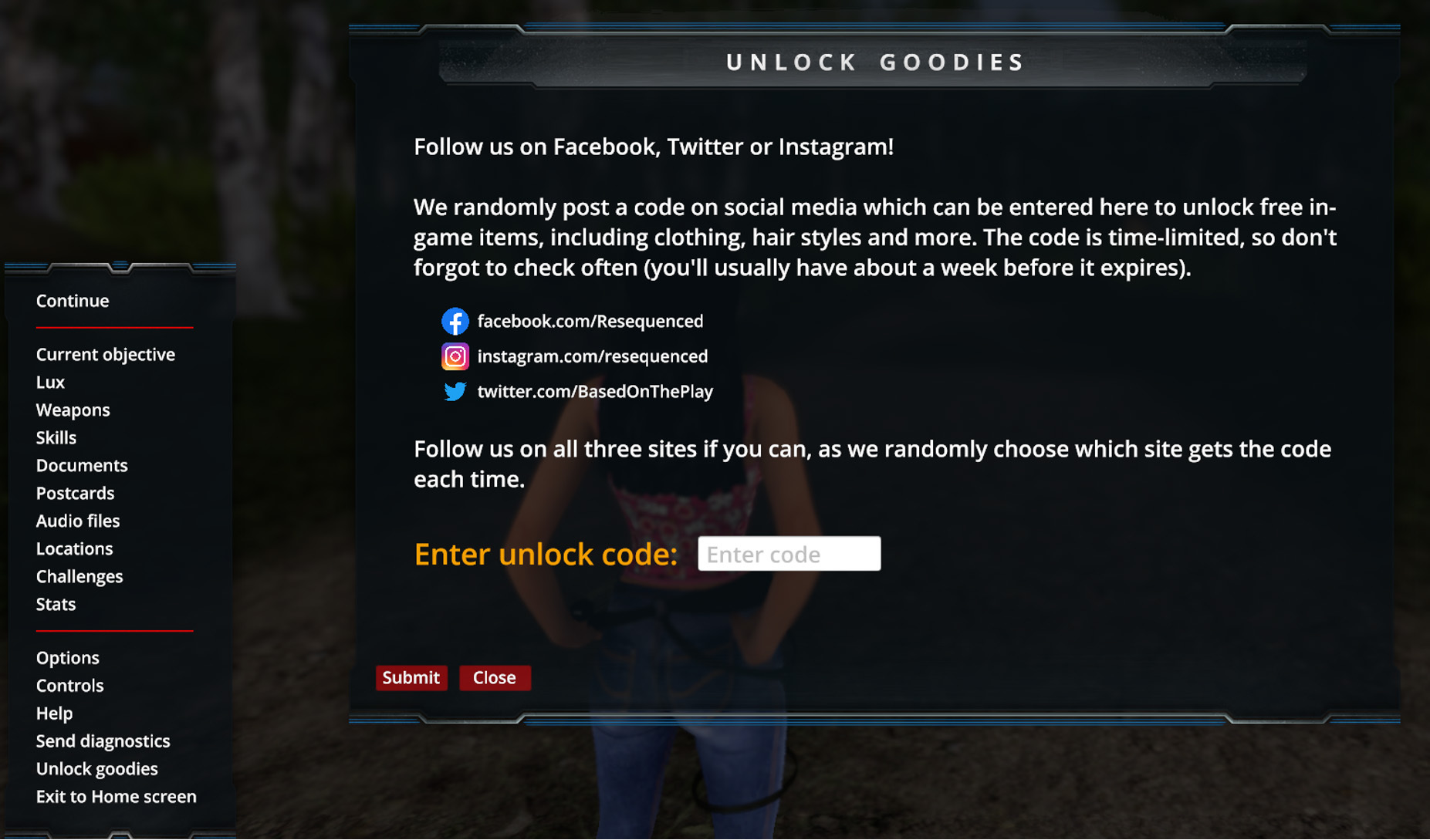 Changed the new "Unlock goodies" feature to drop more loot. It now drops up to 12 items from the Lux menu (or less if you've already unlocked them). Also, the same code is now published to all our social media sites at the same time, so you only need to follow us on one of them to unlock everything.