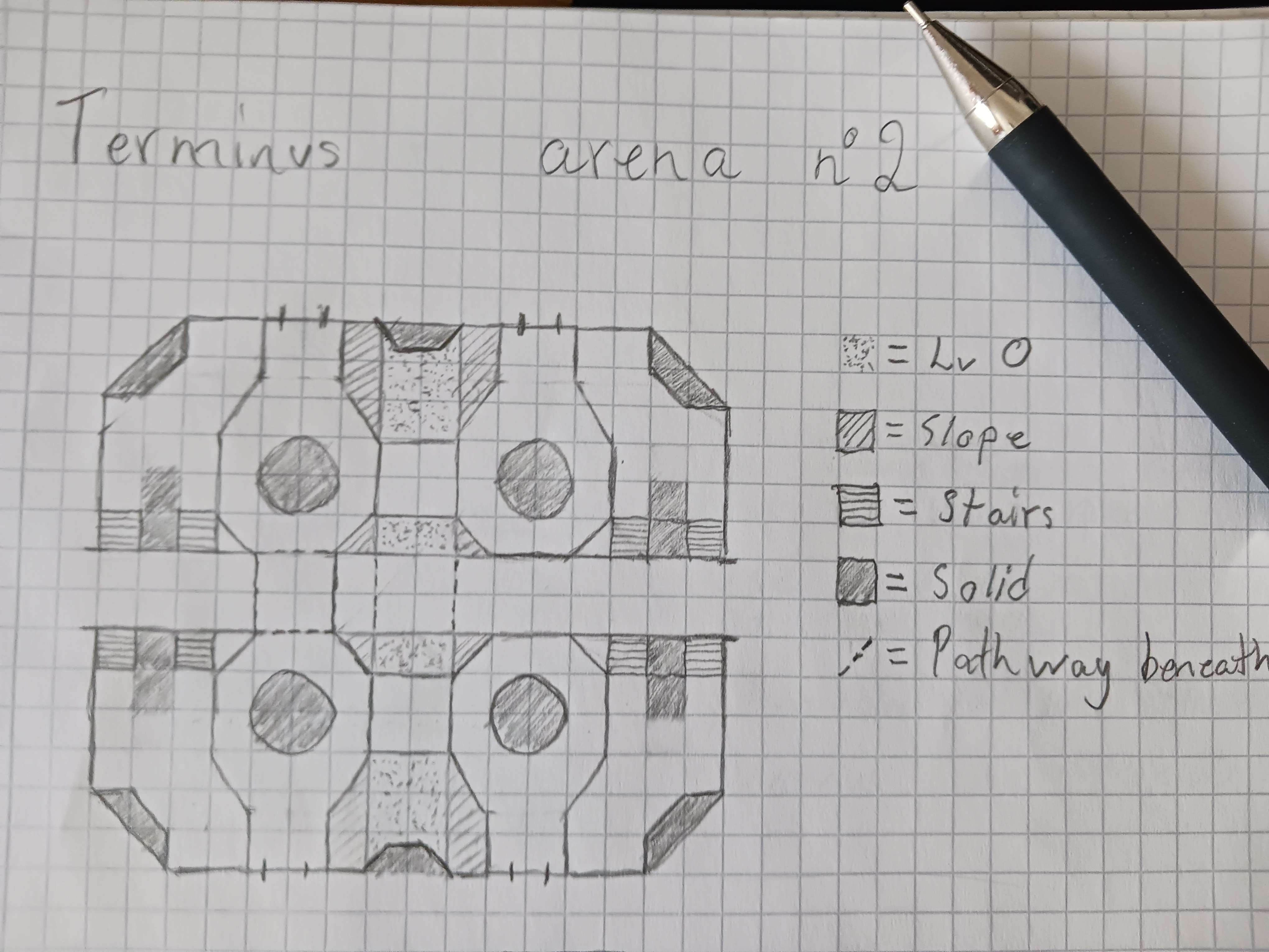 Flow structure First step is to think of a flow structure that is unlike a previously created arena and then draw it on paper. This process is very iterative and works like a check gate to whether the initial idea has some flow structure problems in certain areas of the arena and if the idea is actually worth continuing working on.