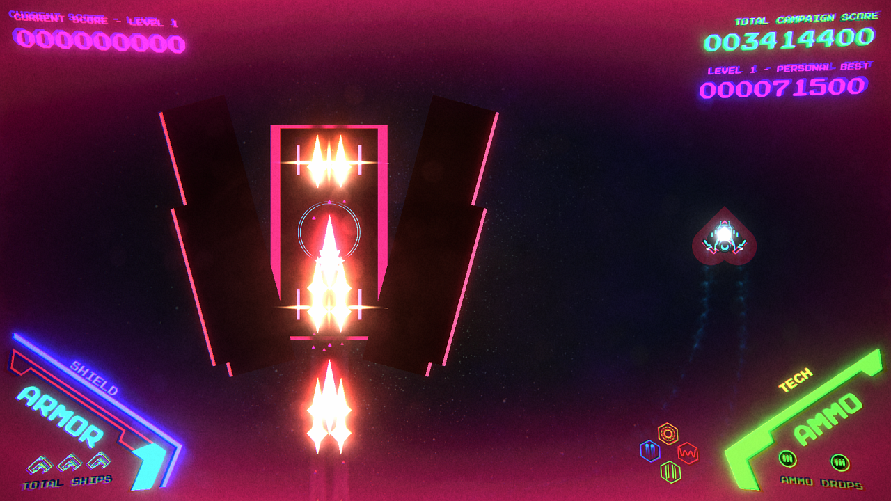 Every time you kill an enemy, you lose points. Your ship even has a new look to fit the theme. And for those of you not feeling so peaceful, there's even a heart filled treasure buried within the unlockable arsenal.
