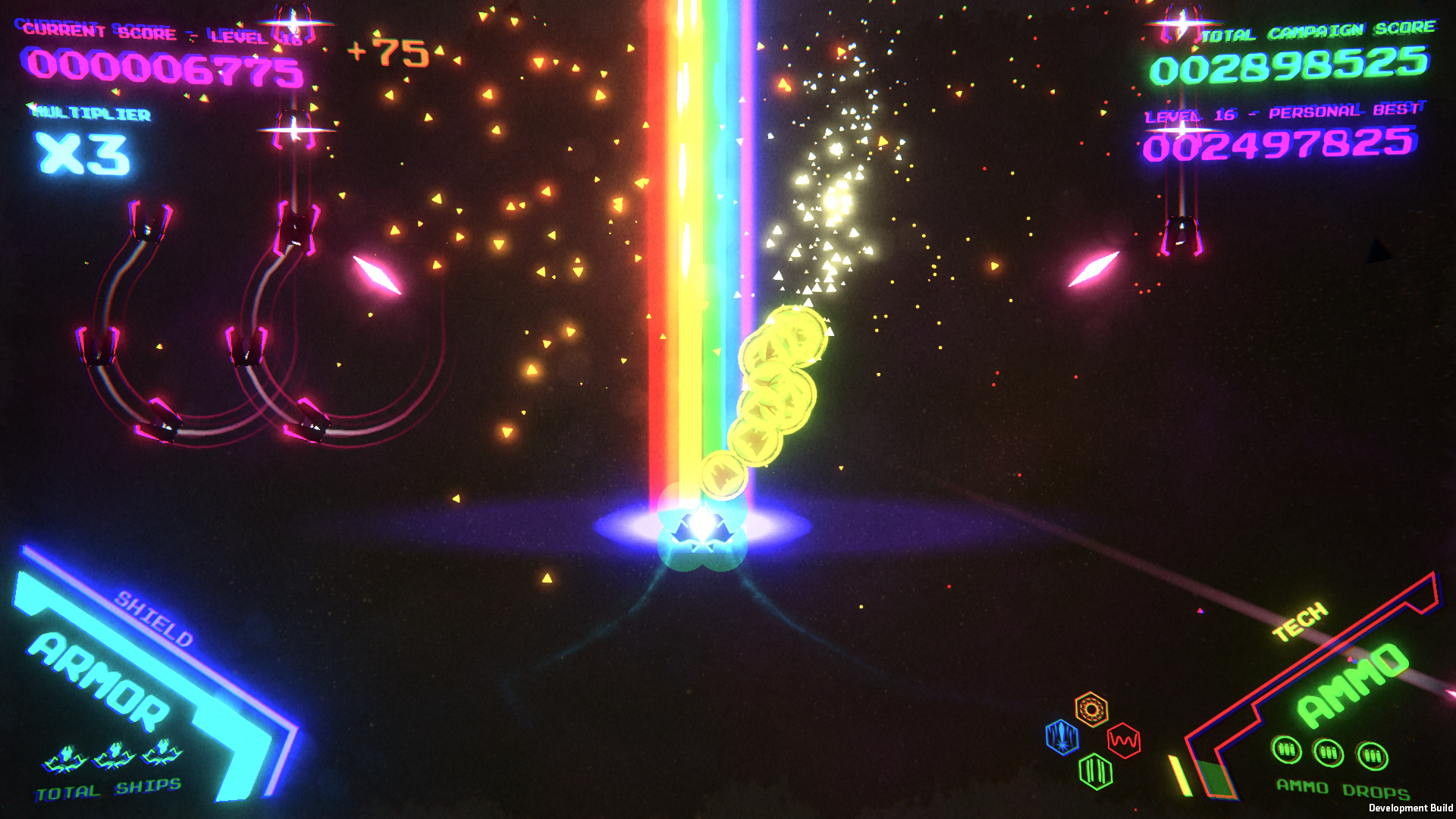 This is no fool’s gold. REVO just introduced a new in game event. When you boot up from now until the end of March, you can enable the Lucky Stars event. You can fly a green ship, collect sparkly gold coins, and enjoy a magically delicious variation on the most powerful super weapon in the game: the Rainbow Super Beam.