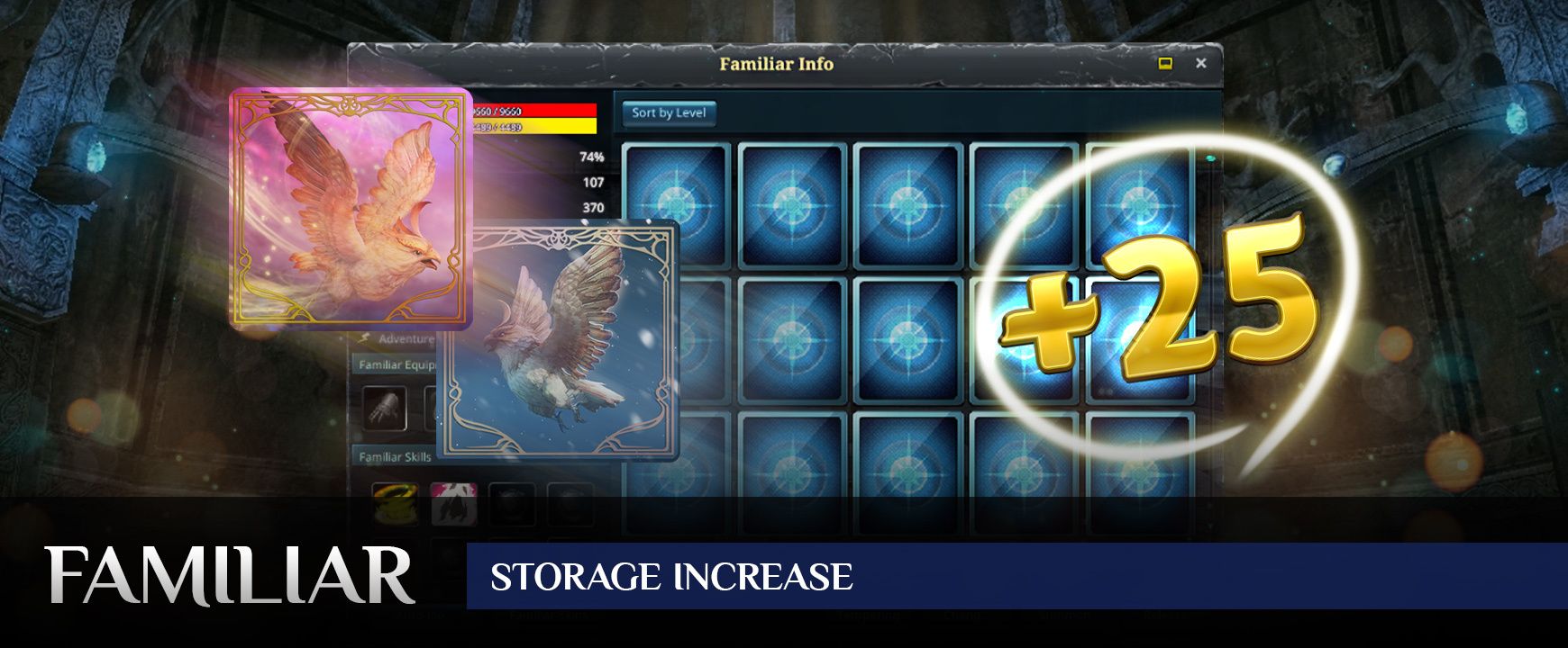 It's no secret that we've been messing around the Familiar Storage for quite some time now. Even having shown 5 extra slots that weren't available for anyone to access at all. We're happy to finally announce the news that an increase of 25 slots in the Familiar Storage is now available for everyone to purchase using Elluns! As soon as the maintenance ends, you'll be able to scroll down as far as 90 slots instead of the original 65 and continue taming more familiars.