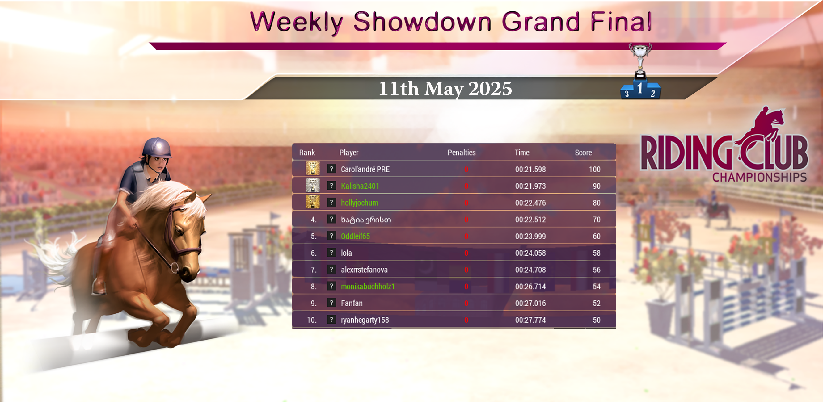 Huge congratulations to our Weekly Showdown Grand Final Winner, Carol'André PRE who wins with a great round! Our course this week produced a very competitive Grand Final with many riders going clear. Congratulations to everyone who made it through and did so well :)