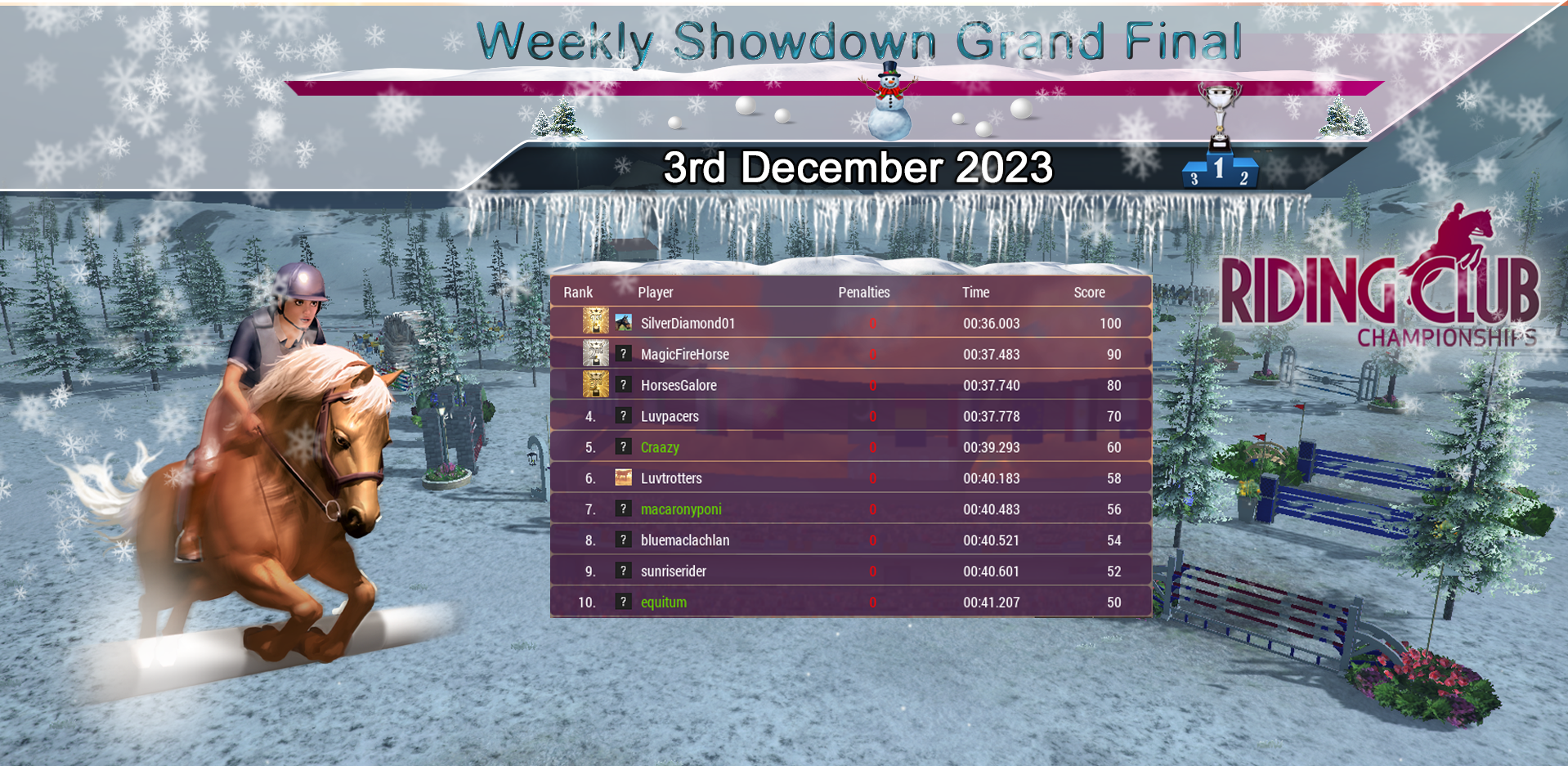 Huge congratulations to our Weekly Showdown Grand Final Winner, SilverDiamond01 who wins with a great round! Our course this week produced another tough Grand Final with just 10 riders going clear! Congratulations to everyone who made it through and did so well :)