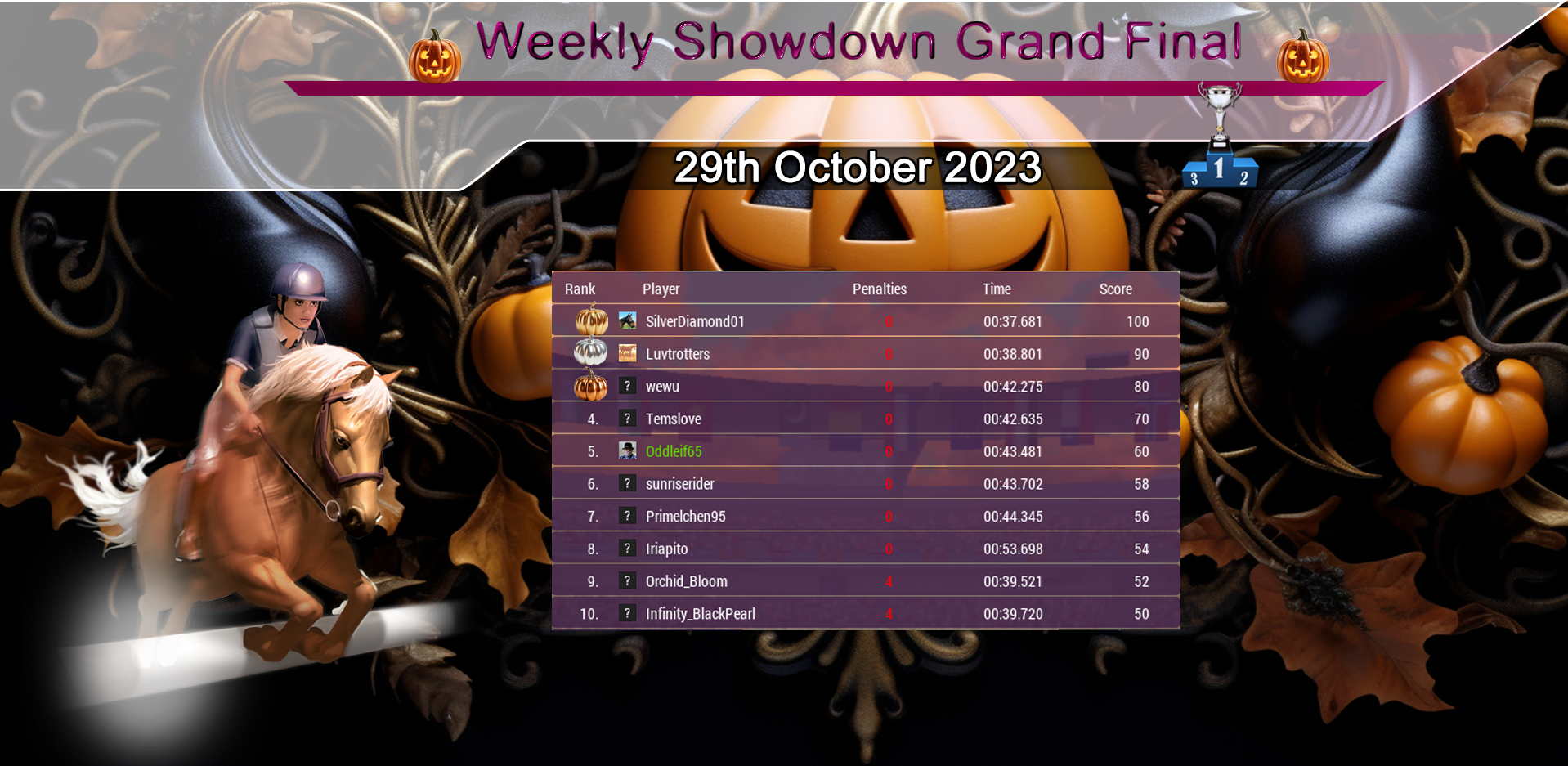 Huge congratulations to our Weekly Showdown Grand Final Winner, SilverDiamond01 who wins with a great round! Our course this week produced a hard fought Grand Final with only 8 riders going clear. Congratulations to everyone who made it through and did so well :) Happy Halloween everyone! 🎃