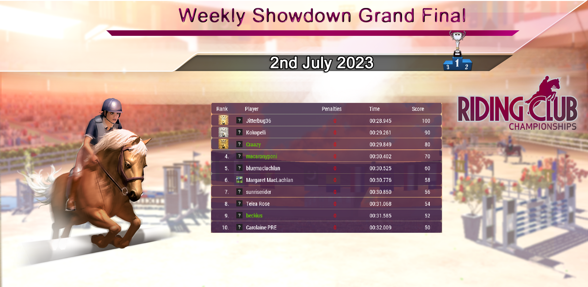 Huge congratulations to our Weekly Showdown Grand Final Winner, Jitterbug36 who wins with a great round. Our course this week produced a very competitive Grand Final with 30 riders going clear! Congratulations to everyone who made it through and did so well :)