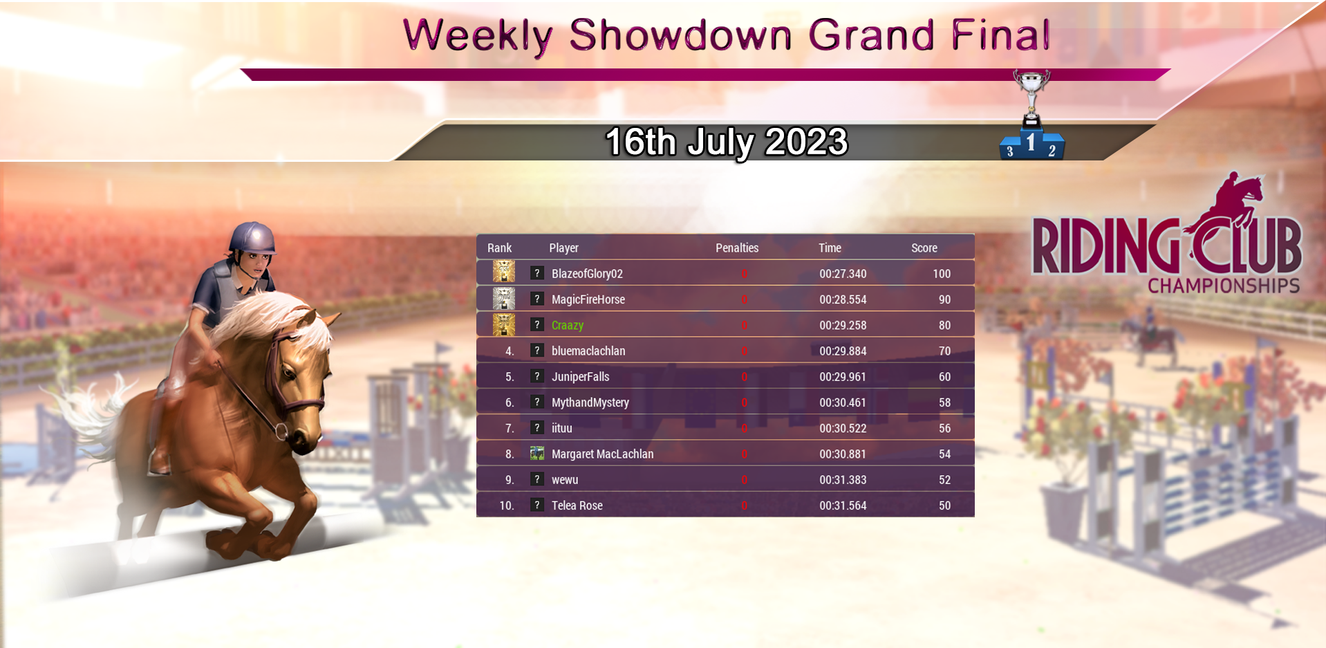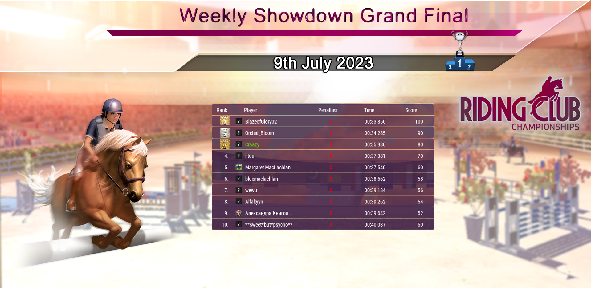 Huge congratulations to our Weekly Showdown Grand Final Winner, BlazeofGlory02 who wins with a great round! Our course this week produced a very tough Grand Final with just 6 riders going clear! Congratulations to everyone who made it through and did so well :)