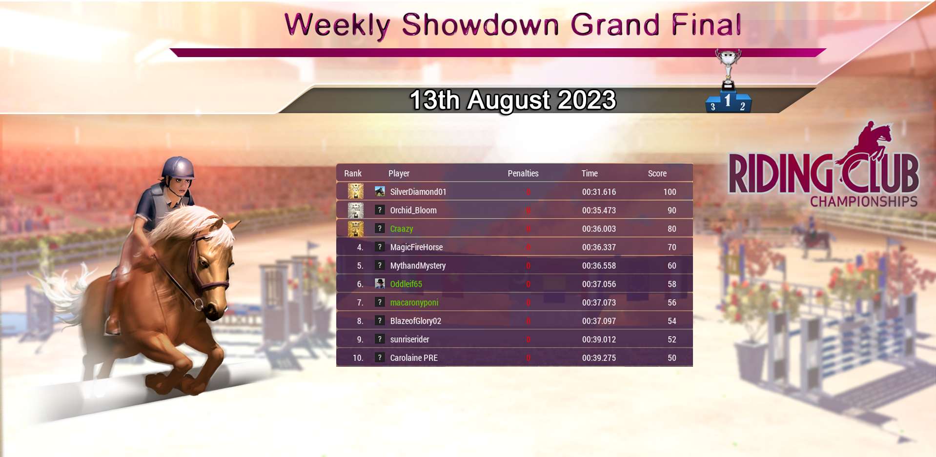Huge congratulations to our Weekly Showdown Grand Final Winner, SilverDiamond01 who wins with a great round. Our course this week produced a very competitive Grand Final with 22 riders going clear! Congratulations to everyone who made it through and did so well :)